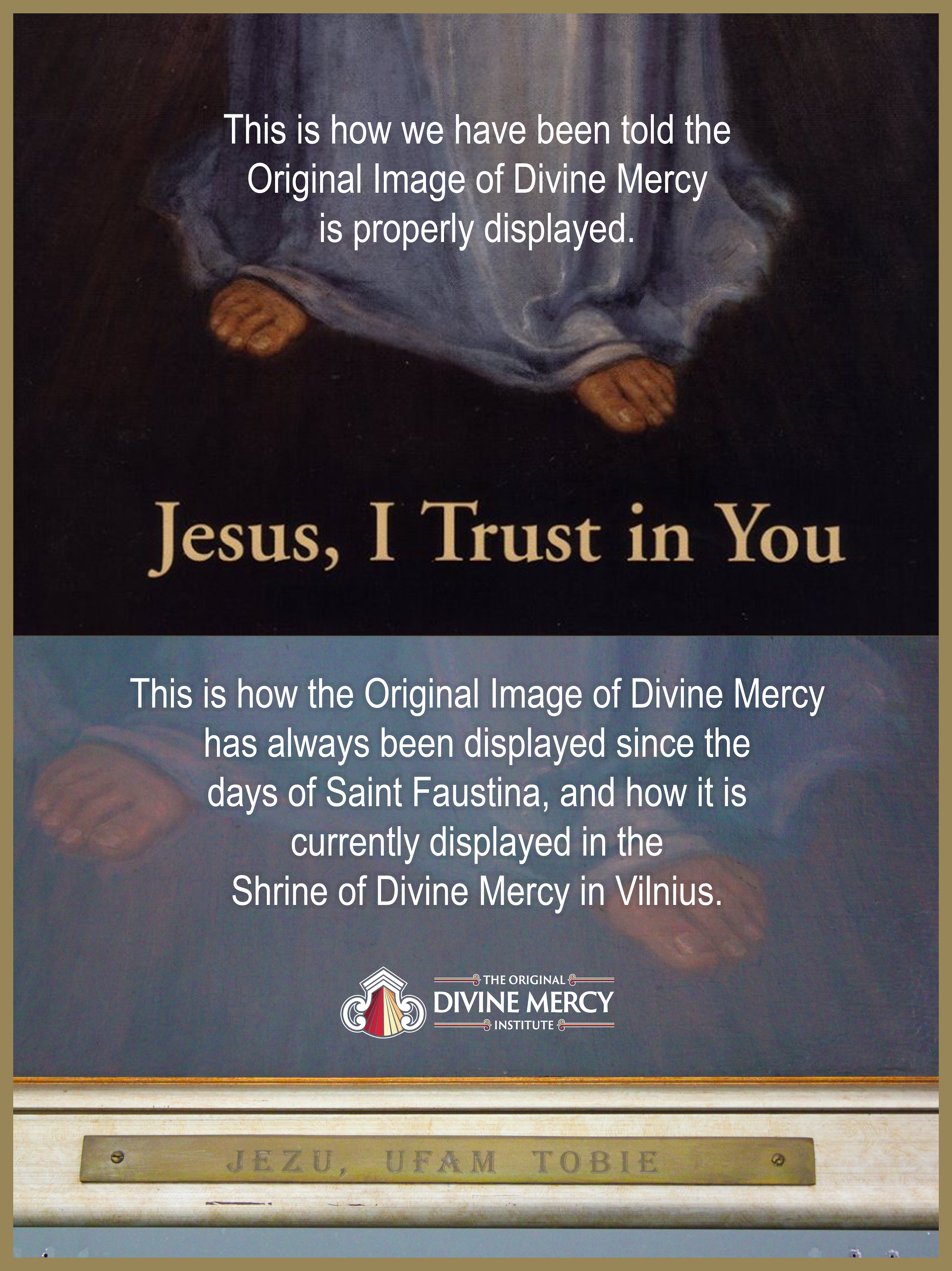 “This placement (on the canvas under the feet of Christ) necessitates drastic computer manipulation of the painting. Considering that on the Original Image of Divine Mercy, which hangs in the Shrine in Vilnius, there isn’t room for the inscription under the feet of Jesus. The canvas itself seems to insist that the inscription – Jesus, I trust in You – be placed on the frame below. And traditionally, that is where it had always been.”